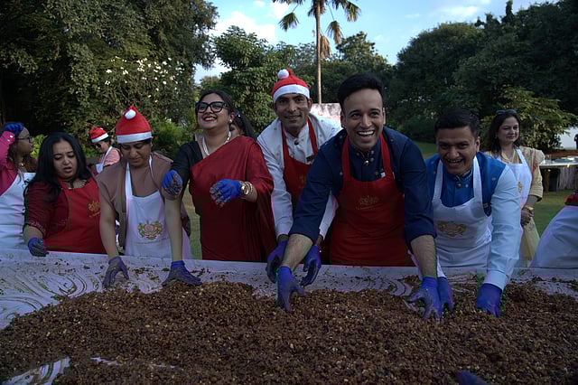 The afternoon saw socialites, influencers, and guests walk into the palace lawns, ready to embrace the Christmas cheer. Aprons tied, Santa hats on, and spirits high, everyone gathered around long tables filled with a mixture of candied fruits, nuts and spices. What followed was a pleasant dight of colours, aromas, and laughter as guests rolled up their sleeves and immersed themselves in the joyful ritual of mixing the ingredients for the season’s Christmas cakes.