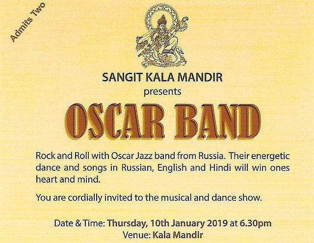 Kala Mandir will host a Jazz and Ballet show by a Russian vocal and instrumental music group- OSCAR tomorrow. Musicians of the acclaimed band, such as Andrey Kapustin (Bass Guitar), Viktor Kipkaev (Drums), Vadim Gurbolikov (Keyboard), Viacheslav Kiryukhin (Trombone), Sergei Pyzhov (Saxaphone), among others will be performing traditional and modern styles of Jazz and Rock, along with songs in Hindi, English and Russian. By invitation only.