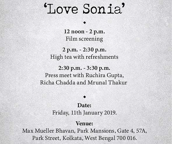 Max Mueller Bhavan, in association with Alliance Française du Bengale will be screening the critically acclaimed movie- 'Love Sonia' tomorrow. The screening will be followed by a press meet with Richa Chadda, Ruchira Gupta and Mrunal Thakur