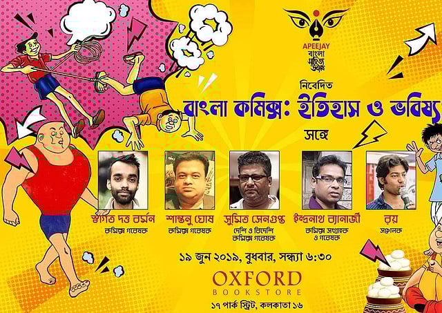 Join an interesting chat session on the history and future of Bengali comics genre with comics researchers Swagata Dutta Burman, Shantanu Ghosh, Sumit Sengupta and Indranath Banerjee, organised by Apeejay Bangla Sahitya Utsab at Oxford Bookstore.