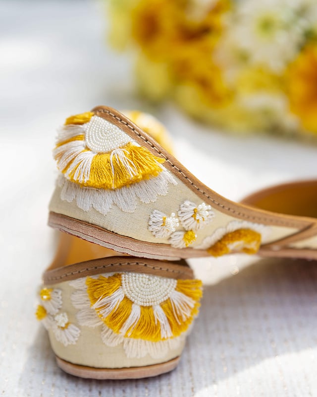 The Sunflower Serenade is an ombre pair of lustrous beads in shades of ivory and yellow, in the front and blooming 3D sunflowers hand-crafted in delicate thread work in the back. The contrasting design styles of the jutti, lends it a beautiful uniqueness.