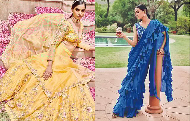 Focusing on dusty rose, red bud, silver pink, foam green, sunflower, pastel yellow, smoke green and boulder beige among other colours, the edit features silhouettes in organza, net and georgette. Look forward to gowns, a line floor length dresses, asymmetrical and symmetrical front open tops and tunics paired with georgette shararas and organza skirts.