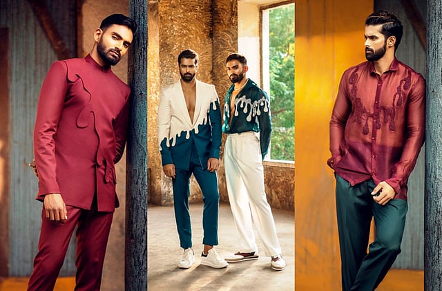 Look forward to suits, bandhgalas, shirts, high-waisted pants and statement cummerbunds in wool, organza and cotton. “The whole capsule isn’t out yet, we’ve released six ensembles, so far, and four are on their way. I’m simultaneously still working on my previous capsule of upcycled lehengas as the orders haven’t stopped. Next up is a tone-on-tone bridal collection and I am also experimenting with some conscious couture,” he concludes.