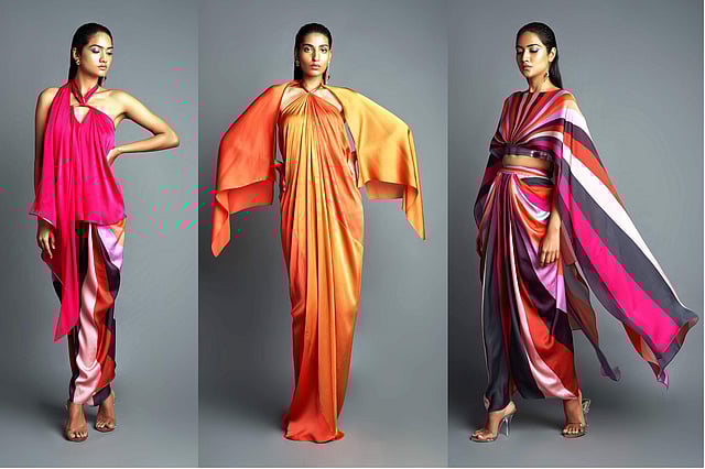 “I think on the visual aspect of it, the amount of colour that has gone into the collection is what makes it visually extremely different. As a brand we go for metallics, mostly monotone, or we work around a similar palette of colours playing only with lightness or darkness in the same tonality, but this time we’ve got really abstract colours together. The DNA of the brand remains the same with very conscious structuring or fluidity and usage of new-age materials,” Amit begins.