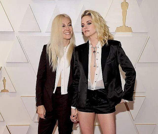 Nominated for the first time for portraying the role of Princess Diana in Spencer, Kristen Stewart ditched the elaborate gown for shorts and a blazer. She arrived at the red carpet in a custom-made Chanel blazer, white chiffon blouse - buttoned down till her waist, and hot pants. She is the brand's ambassador and even for shoes, she went with Chanel. She completed the look with a diamond necklace from the brand's Ganse Noire Spinelle collection. This dramatic choice of hers created an iconic fashion moment at the red carpet. She was also seen posing with her fiancée, Dylan Meyer, for the first time at the Oscars. They wore matching suits and were also seen stealing kisses at the event.