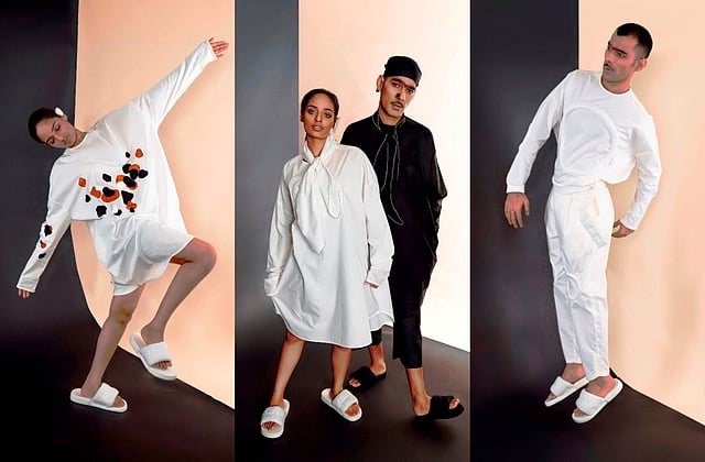 The collection, which is limited to two tones, black and white, is restricted to cottons and has just one silhouette for tops and two silhouettes for bottoms. It follows minimal construction with abstract surface work that is chosen to flatter every gender and body type.
