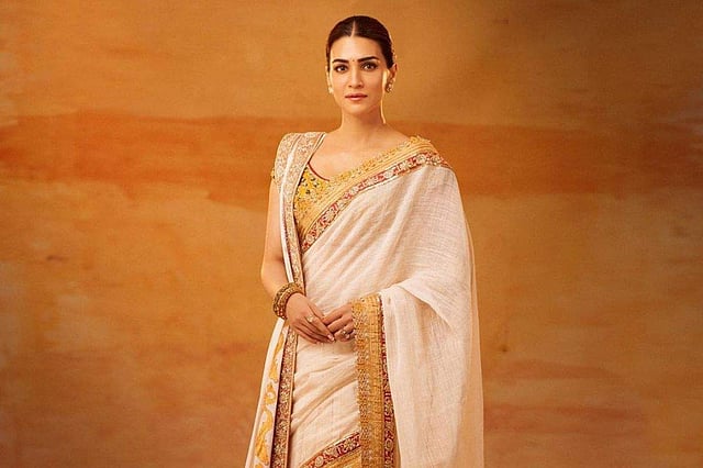 Actress Kriti Sanon attended the trailer launch event of her upcoming film, Adipurush, donning a double-draped sari designed by Abu Jani and Sandeep Khosla and the actress was a vision in the white and gold-hued outfit. The sari boasted intricate work of 24-carat gold and copper and according to the designers, it was inspired by the ‘purity of Sita’, as the actress is playing the role of ‘Sita’ in the upcoming film.