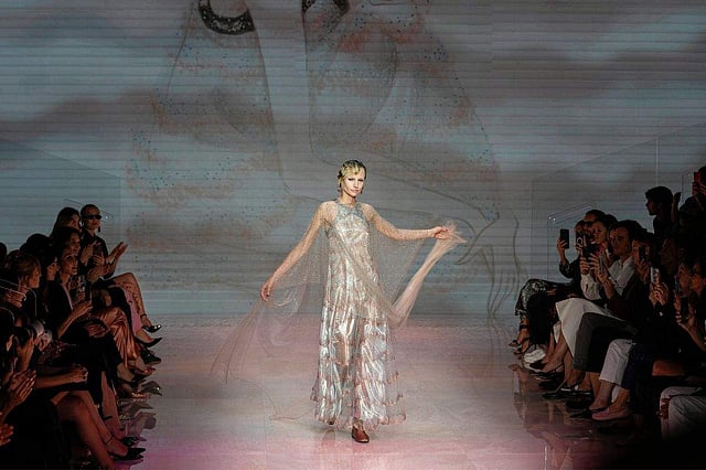“Vibrations, that means colours, that means movement, that means a structure that moves on the body,″ Armani said. To demonstrate his vision, a model in a shimmering long dress and a diaphanous cape danced down the runway.