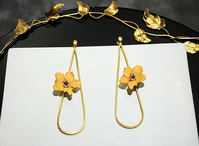 The collection features ear cuffs with motifs of blossoming mogra buds, lightweight gold-toned twist drop earrings with hand-painted ice blue lilies, avant-garde collar neckpieces with orange lily replicas and bud flutes. One can also spot mogra bud detail set against a sculpted band. The surprisingly lightweight maangtikas and hathphools are exquisite and will easily make any bride the cynosure if they opt for it. We were told that for these designs, the base metal remains copper with 22-carat gold plating and are, at times, studded with tanzanites, emeralds and pearls. Ear cuffs have always been her signature and this time too, she has an array of them — from minimal crest ear buttons to dramatic bud flute cuffs and those with pearl drop pendants. “Just pull your hair back and dazzle everyone with these cuffs,” says Suhani, giving us a styling tip as she signs off.