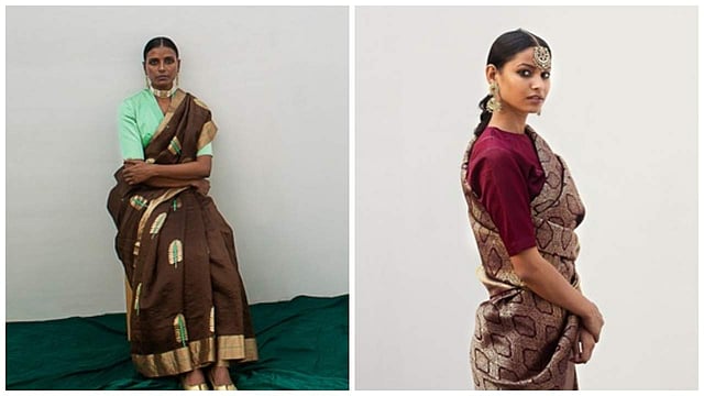 While the designer’s pick from the collection is a striped organza silk sari, Sanjay suggests building festive ensembles around any of the collection’s unstitched drapes. “A cotton sari can be equally as festive as a Benarasi, it’s how one wears it.”Perhaps a crop top or a brocade blouse to dress the drape up or a solid jewel-coloured blouse for a more formal occasion.