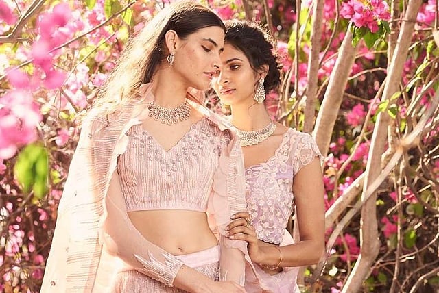 Breaking away from their label’s staple hues, The Right Cut’s latest line throws shades like wine purple, deep red and grey into the mix. “We have always been biased in favour of lighter shades. But we have seen a growing demand within the eveningwear segment,” explains co-founder Avisha Agrawal. Inspired by flowering trees, Garlands of Gulmohar uses motifs like rose bell buds and berries on a variation of angarkhas, dresses, skirts and kurtas. Rs 5,000 onwards.