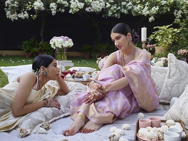 A spot of shopping followed, after which we drove to Angadi’s textile studio in Jayanagar to see first hand how the fabrics that are turned into saris and garments are made. We were given a crash course on how to read the computerised patterns that craftsmen use as a guide to weave the designs required and were shown numerous fabric swatches that are testaments to Radharaman’s commitment to experimentation. For instance, there were ikat-inspired jacquard weaves, where ikat-like patterns are woven on a jacquard without using the tie and dye technique, and the khadua Kanjeevaram, where the buttas are rendered all over the sari, rather than just in a specific area. This immersive session saw discussions shifting from the sanctity of handlooms to the practicality of mill-made fabric and how we could possibly move forward by striking a balance between the two. Then, we gathered at their newest and sprawling store, a stone’s throw from Ashoka Pillar, for some Indian classical music and a sit-down dinner. Our first day complete, we reconvened the following morning for our journey to Karaikudi, the architecture and culture of which forms the backdrop for the campaign for the Eternal Series, a collection of bridal saris by House of Angadi’s design label, Advaya.
