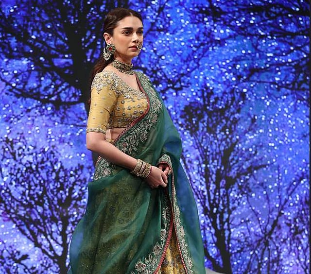 The recently concluded India Couture Week showcased the exquisite craftsmanship of the most notable couturiers from across the country. On day five, designer Anju Modi, known for reviving the indigenous crafts of India, presented her collection The Road Less Travelled which marked her three-decade journey in the fashion industry. The collection encapsulates the designer’s takeaways from her insightful expeditions, that have put Indian heritage crafts and traditional weaves on the global map. The spectacular show had the gorgeous Aditi Rao Hydari as the showstopper in an embroidered mustard and olive green lehenga. The other models wore elegant ivory saris, delicately embroidered off-white sherwanis, modish kaftan sets and fusion wear ensembles. Talking about her collection, the designer tells us, “The Road Less Travelled is very close to my heart. It is inspired by my journeys around the world and is a tangible representation of my learnings, adventures, and explorations. The idea is to set viewers on an experiential journey as if they are viewing and flipping the pages of my personal travel journal and thereby learning about the label through my eyes. We have used different fibres like twill and matka silk along with vibrant thread work and rich zardozi embroidery to accentuate the look of the ensembles.”