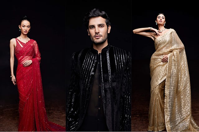 Through “Illume” I wanted to explore glamorous cocktail options that bring together the best of both worlds.The edit displays flowy silhouettes adorned by our signature sequin embroidery. Each of the pieces mark timeless designs, highlighting elegance and finesse. The collection is home to a range of sequined cocktail sarees and lehengas for women and bandhgalas in shades of black and blue for men.