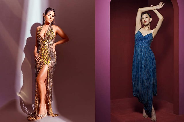 For cocktail parties, Sahil Kochhar has the perfect solution for you. His exquisite gown, crafted in organza, features a deep neckline and a panelled straight silhouette with a stylish slit. The collection showcases the brand's signature 3D appliqué embroidery technique, which uses tonal velvet and metallic sequins to create a stunning and unique look. Drawing inspiration from the geographical terrains of Israel, this collection is truly one-of-a-kind.