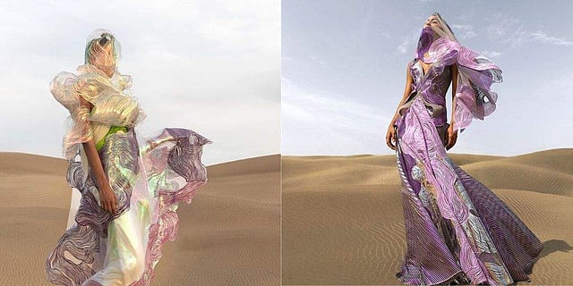The result is a 30-piece collection comprising 16 womens-wear ensembles like gowns, draped saris and lehengas and 14 menswear dresses that vary from flowy to structural pieces in the label’s signature shades of ivory, storm grey, plum and charcoal. The collection focuses on lightweight couture pieces in a range of pastel and soft hues. It harkens on techniques like pleating, weaving and embossing of wave patterns on chiffon and liquid mesh. His signature polymers and hand corded elements are used to mould the structural pieces so they can suit myriad body types. The Delhi-based designer has also used hand cording, embroidery and metal fixtures on fabric to accentuate the elegant appeal. These interesting techniques and subtle colour palettes encapsulate the imagery of sand dunes and airwaves on ensembles.