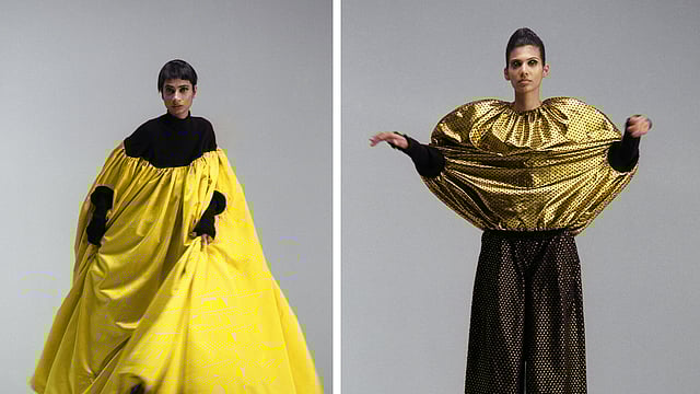 One of the ideas was to look at what handwoven knitwear might look like as a starting point. It’s the first time we’ve explored lycra on the handloom, alternating between silk and lycra. The result has multiple effects, including the palla being treated as a fluid blouse. We have also woven gota with silk; the former is conventionally used as surface ornamentation in traditional wear. This gave us fabric with a heavier weight allowing us to experiment with draping more sculptural forms. We used welding in our garments to create metal frames and circular rings to showcase the elasticity of handloom lycra and allow for sculptural forms.