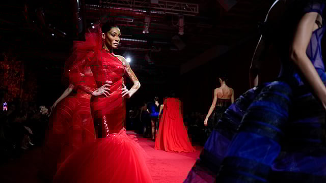 In a striking blend of masculine and feminine aesthetics, model Coco Rocha wore a black tuxedo blazer mini dress, dramatically draped with red silk. Male models flaunted glossy cropped jackets and wide-leg pants, baring their abs as they walked the runway. Singer Adam Lambert arrived in a dark brown long-line blazer coat, adding to the star-studded atmosphere.