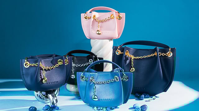 Handcrafted in Italy, these bags are made from plant-based corn leather and finished with 22k gold-plated hardware and chrome chains, featuring delicate pebble details. “By embracing plant-based alternatives and working with Italian artisans, we’re redefining luxury with a conscience, honouring traditional techniques while pushing the boundaries of responsible design,” she elucidates. The innovative corn leather promises the same softness, durability and elegance as traditional leather — but without the environmental cost or harm to animals.
