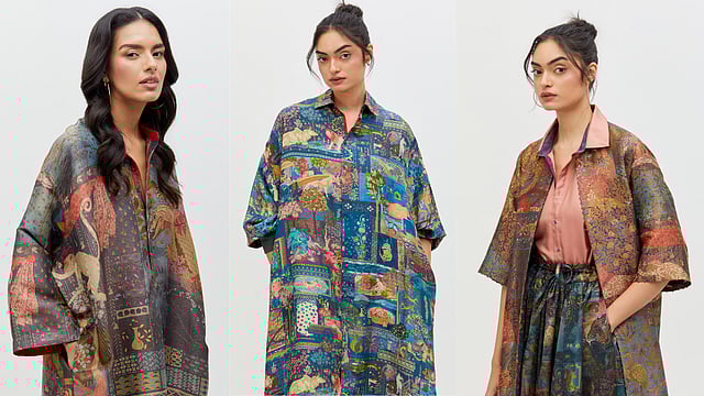 Traditionally focused on menswear, Suket’s newest collection expands into womenswear. Silhouettes flow between traditional kurta-pajamas and modern cuts—dresses, coats, part-kurtas, and jackets.