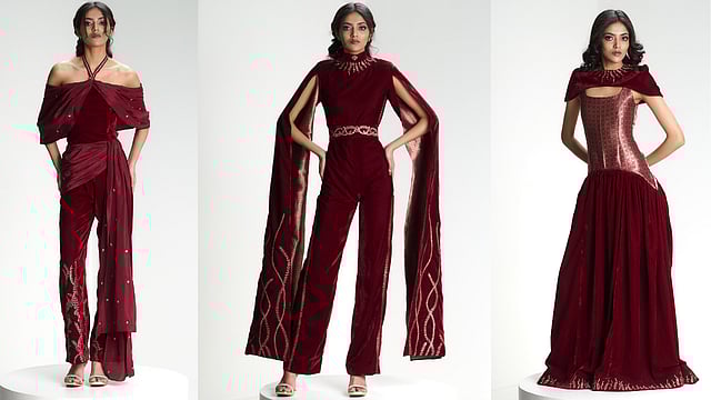 Her use of Banaras zari and burgundy velvet underscores her commitment to Indian craft. “Using Banarasi zari was my way of honouring Indian textile heritage and the hands behind the craft,” she says. “It brings a quiet richness and history into contemporary silhouettes.” Burgundy velvet, meanwhile, “adds depth and sensuality; it holds light beautifully and evokes warmth, nostalgia, and occasion.”