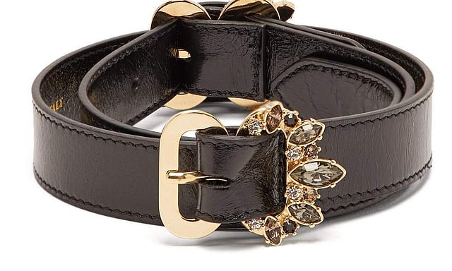 Erdem’s double-buckled leather belt is sure to make a lasting impression. The crackled leather belt has two-tone gold buckles with fastenings encrusted with green and beige marquise-cut crystals. Rs.24,693 approximately