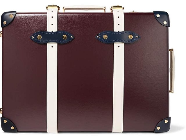 Globe-Trotter is a royalty-approved luggage brand. Take one look at its Goring trolley bag and you’ll know why. Handcrafted from merlot fiberboard, it comes with white and midnight-blue leather and gold accents. On the inside, it is fitted with straps (to hold your clothes securely) and lined with silk damask patterned fabric. Rs.1,88,195 approximately