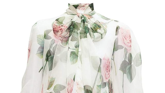 Dolce & Gabbana’s pussy bow blouse is made from whisper-weight organza. It is designed with balloon sleeves and features pale pink roses. Rs.62,020 approximately
