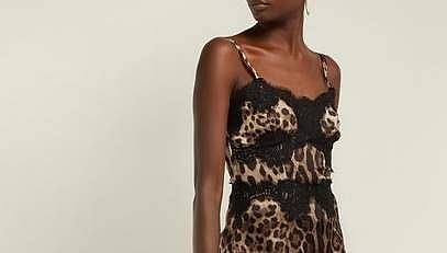 Embrace your wild side with this dress from Dolce & Gabbana. The silk-blend satin dress bears leopard prints and is trimmed with chantilly lace. Rs.1,14,973 approximately
