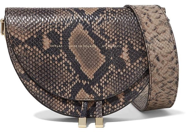 A less obvious way to wear the trend is this half-moon shaped bag from Chylak. It is made from snake-effect tactile leather and bears the label’s name and its serial number printed on the front in gold. Rs.27,190 approximately