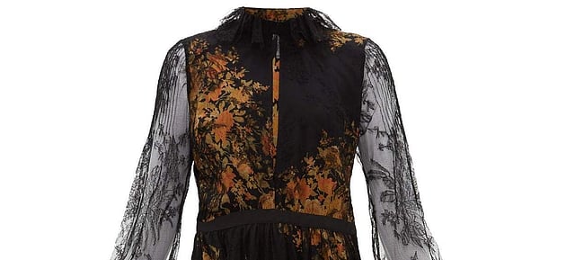 Spotted on Etro’s AW 19 runway show, this gown has a floral-printed crepe layer, with an overlay of whisper-weight Chantilly lace. The floral prints peek through the thin lace to create a dramatic effect. A keyhole slit at the chest, ruffled collar and grosgrain waistband complete the look. Rs.2,95,900 approximately