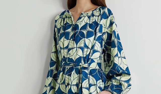 Crafted from waxed cotton, an African dying technique, this Odile Jacobs dress is detailed with circle and square prints in a palette of beige and blue. Cut for a comfortable fit, it has buttons down the front and a self-tying belt. Rs.54,100 approximately