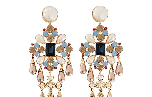 Boasting old-world charm and vintage glamour, the Alizeh cross danglers from Radhika Agrawal are sure to create a lasting impression. They are detailed with Swarovski crystals and pearls. Rs.7,800