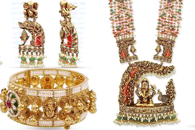 The collection comprises handmade statement Ganesha motif temple jewellery in 22kt antique gold along with tiny Ganesh pendants for positive vibes. You can celebrate good fortune with the iconic image of Ganesha etched forever in the form of jewellery.