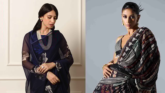Atelier Shikaarbagh shines with its bold and beautiful florals, featuring vibrant prints and luxurious fabrics. The floral motifs pay homage to the traditional Indian block printing technique that Atelier Shikaarbagh masters. A handwoven silk sari is essential for the festive season, embodying rich texture and a regal aura—truly the epitome of festive luxury.