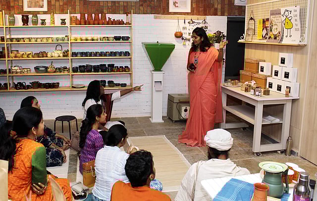 “It’s not just a retail store for handcrafted products, but one for customers who like to go slow, question and understand the process and stories behind everything sold here. We will also have workshops and discussions every weekend on conscious living, wellness, cooking and baking with traditional wholesome grains, crafts etc,” explains social entrepreneur Hema Balakrishnan who runs the 1,500 sq. ft. store. Besides Hema’s handmade retail terracotta jewellery line Color D Earth, it also stocks designer handlooms by Abhihaara, owned by her friend and award-winning entrepreneur Sudha Rani. The store has ‘consciously’ curated handmade products by artisans from across India, says Hema. Among the other products are ceramic pottery, handcrafted home  décor, natural skin and hair care products. “We call it ‘conscious’ because the store empowers artisans, weavers and food producers and gives them a sustainable livelihood,” says Hema, pointing out  what’s different about the store.