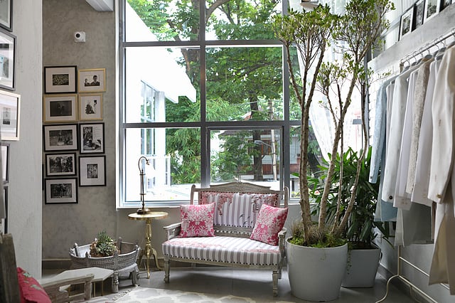 While they retail out of multidesigner boutiques such as Ogaan in Delhi and Atosa, Mumbai, the Indira Nagar address is their first standalone store. Whitewashed exposed brick walls, antique furniture (some dating back 100 years), framed art, statement light fixtures and an edgy grey and white colour scheme offset with floral and striped wallpaper in vibrant hues give the space an easy, welcoming vibe. “Some of the prints we’ve used on the upholstery in our furniture are from our latest collection, Les Fleurs du Printemps, which is a celebration of flowers,” shares Anu, adding that their label is divided into couture, pret and diffusion. The pastel-hued garments of Les Fleurs are embellished with 3D flowers each made with individually hand-cut petals. Employing a mix of habutai silk, Chanderi silk and novelty knits, the garments stay true to the essence of the label’s design philosophy, which is celebrating the marriage of contrasts — fluidity and structure, darkness and light, and softness with solidity.