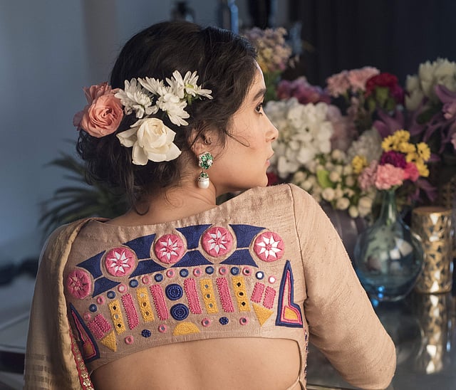 A fashion marketing graduate from the London College of Fashion, Gursakhi’s collection is an extension of the first ever blouse she designed for herself and to this day is one of the most pinned backless blouse images on Pinterest, we learn. ”It is quite an embarrassing story, to be honest. It was a blouse that I designed for a wedding that I had to attend and as soon as I put it up on my Instagram page, the picture went viral. Even today, if you look for sassy backless blouse designs, this picture pops up,” she says with a laugh. Boho-tribal inspired, all her designs make use of embroidery that features Aztec motifs and patterns like fish and elephants. “We have only used thread work in the collection. Surface design includes a plethora of patterning from spider stitches, to African beading to Mukaish work, mirror work and leather embellishments.” One can also expect to find the brand’s signature tassels and pompoms throughout the collection.
