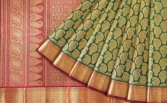 “All our designs are distinct so that they look elegant when customarily pleated and accessorised with heavy jewellery,” she shares. The classic motifs of parrots, florals, and geometric shapes are created using zari in gold and silver, with fabrics for blouses additionally available separately, if customers prefer contrasting shades. This myriad of 35-40 limited edition saris are laboured over by traditional Kancheepuram weavers over a period of 10-15 days.