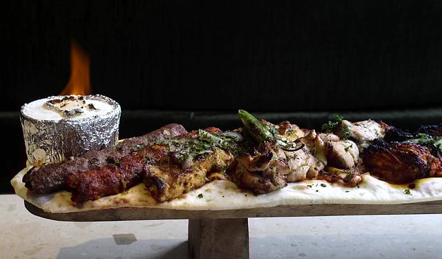 Noticing that there’s some time for the next dish to come, we walk up to the head chef, Mohammed Faleh Booreny, from Jordan who curated the menu. “Make sure you try the Zarb,” he says, adding that he makes sure to get the rice from Egypt. Zarb is made in a coal oven and slow cooked for four hours. The way the Zarb is brought to the table, in flames, is rather dramatic! The fragrant rice tossed in spices and well-cooked mutton reminded us of mandi. When their signature kebab platter, Levant Mashawi Mushakal, arrives, we are astounded by its size. It contained eight kebab variants, including lamb (laham in Arabic) and dajaj (chicken), with which we wrapped up our  meal.