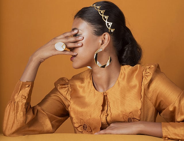 Each of the hand-crafted pieces is made with either copper or silver and plated with 22 K gold. We were thoroughly charmed when we discovered that her jewellery not just consists of earrings, neckpieces, bangles or finger rings- but also a headbands-an accessory which has survived in the wardrobe of women –since ages but never becomes old.