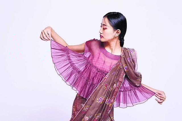 Inspired by the sari catalogues of the late ’80s and early ’90s — the era of the wispy poly-silk drape that was dominated by juxtaposing floral screenprints — the collection’s primary focus is on building a strong print language. “While Gen Next loves their share of heirloom Benaresis and Kanjeevarams, not a lot of them are open to investing in heavily embellished saris. There is now an emerging market for contemporary drapes that are minimalistic, yet chic and can easily transition from day to night wear,” explains Megha, on the brand’s decision to use azo-free prints of flowers like mogra, amaltas and desi gulaab over hand embroidery — an attempt the label ventured into during their last season.