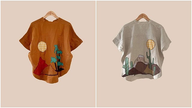 A made-to-order capsule, the line currently focuses on a single oversized boxy shirt silhouette in a natural colour palette of beige, ochre, and ice and navy blue. “As a brand, we have always tried to work towards creating collections mindfully. Until Fabscape, our focus was on fabric manipulation and zero-waste cutting techniques. But, this time around, we have used a lot of upcycled fabrics.” Crafted completely from leftover running textiles from earlier collections, the line’s base fabric is linen. The play on the upcycled fabric scraps (which Lakshmi tells us she collected over three years) is seen as appliqué work on the back body of the shirt. “Mahati’s drawings were digitally illustrated, and converted into the patterns for the needlework,” explains Lakshmi, adding that each garment promises a new iteration of the artwork due to the limited availability of the textile scraps.” You could perhaps look out for a green-hued sun or a brownish-grey polar bear,” she says with a laugh.