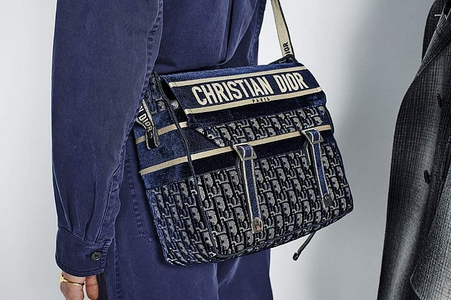 The fabric was used on new versions of the iconic Lady Dior, Dior Book Tote, Saddle and Dior Camp bags in the collection and featured signature motifs such as camouflage, cannage and Dior oblique. The colours include black, blue, burgundy and brown. Here’s a look at the collection:
