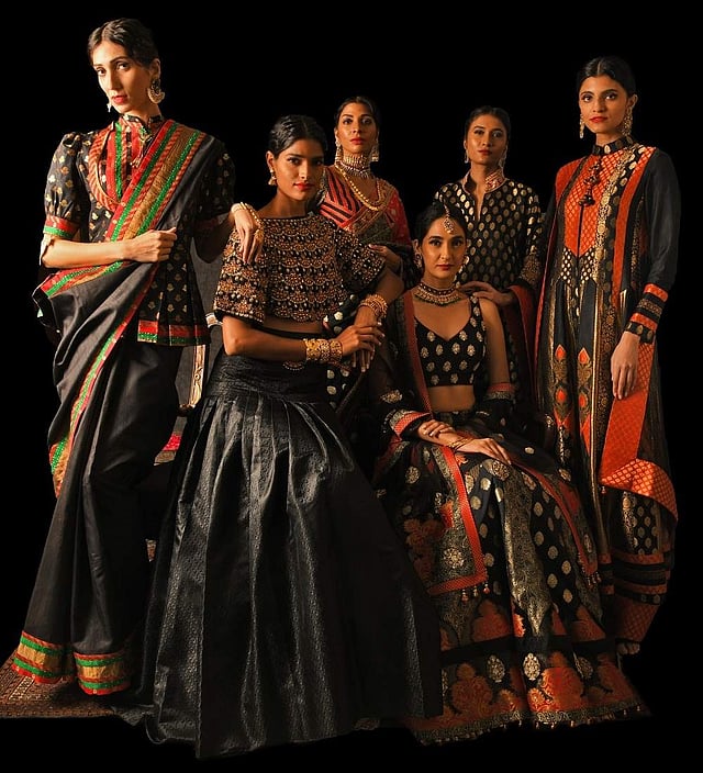 The outfits have interplays of dexterous Appliqué work with unique brocade fabrics, delicate French knots and detailed zardozi embroidery. Minutely designed fabric panels, complex hand embroideries, botanical motifs, intricate Paisley patterns bordered with hand-embroidered beadwork, handmade tassels, form this tribute and collection.