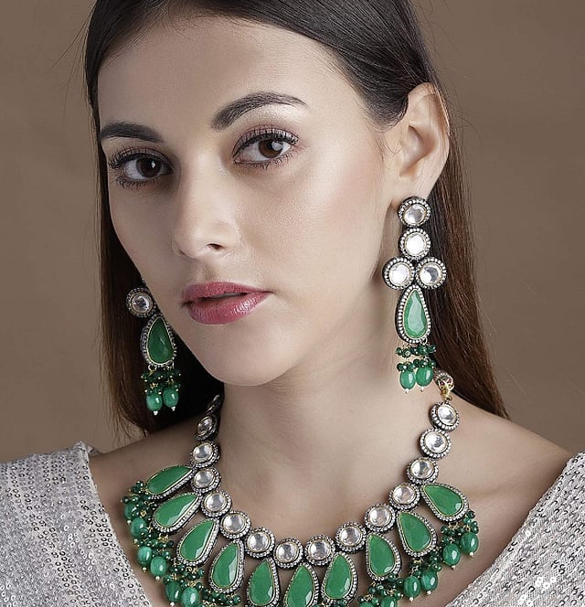 You can opt for a statement kundan necklace or earrings for a rich look, temple-inspired jewellery for a traditional ethnic look, oxidized pieces for a heritage ensemble or stone-studded jewellery for that Diwali glitz and sparkle.