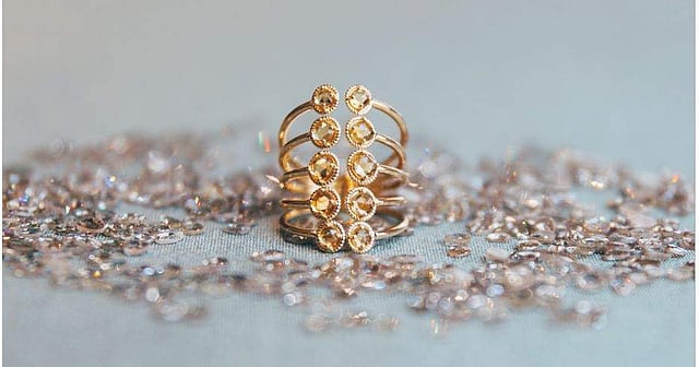 The rings are crafted from 18-karat gold and set in diamonds and precious gemstones like emeralds and rubies.