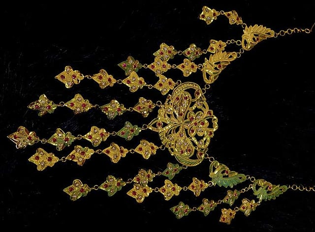 You can spot a multi-layered necklace in pure silver, with a gold plated coating that comes with a statement floral motif. This statement piece, she says, is a recreation of her great grandmother’s wedding jewellery. Each piece is made to order and takes around two months to deliver. The pieces acquire a rare touch as they are handcrafted by the artisans rather painstakingly. The other statement piece that grabs one attention is the Rani Haar-inspired necklace, which translates in English into a piece of jewellery that adorns a queen. And it indeed looks fit for a queen as the necklace with imagined butterfly and circular lotus motif look highly regal and would elevate the look of any bride-to-be.