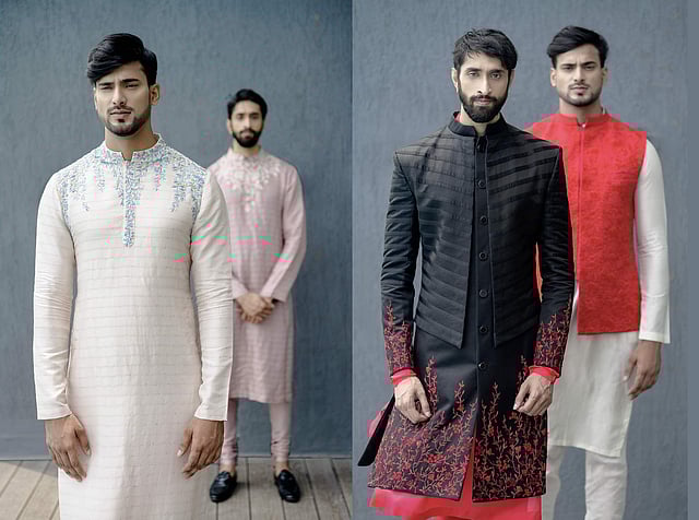 Fashion has transitioned to a need-based entity and people are looking for sustainable silhouettes that can be worn multiple times. So, my collection brings back English colours like nude, dusty pink, pearl grey and moondust blue. However, you will find a streak of crimson which is an integral part of my sherwanis, jackets and kurtas. Also, I have explored the classic resham (silk) embroidery with sequins, which has added a refreshingly timeless charm to each piece.