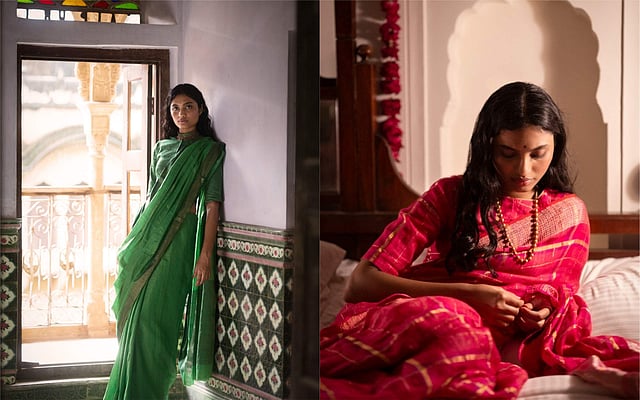 The linen check saris are my most prized drapes in Morakasi. They can be paired with hanging chandelier earrings to make your look more glamorous.